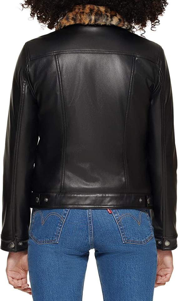 เสื้อแจ็คเก็ตหนังเทียมสำหรับผู้หญิง พร้อมปกขนสัตว์เทียมลายเสือดาว ทรงเข้ารูป ติดกระดุม แฟชั่นฤดูหนาว