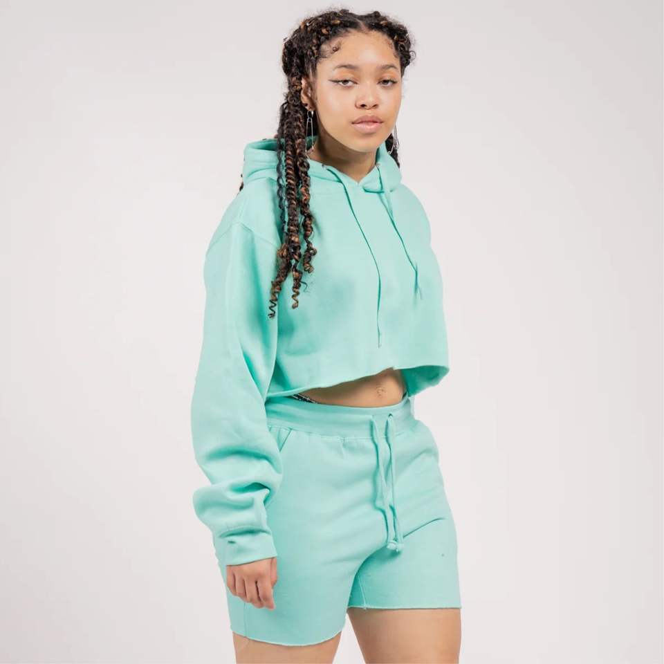 เสื้อครอปสตรีผ้าฟลีซและกางเกงขาสั้นชุดอยู่บ้าน-สวมใส่สบายใส่สบายและเหมาะสำหรับชุดลำลองหรือพักผ่อนที่บ้าน