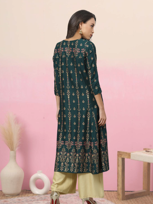 ชุดอานาร์กาลีผ้าเรยอนสีเขียวพิมพ์ลายดอกไม้สำหรับผู้หญิง คอทรงเรือ แขนสามส่วน แห้งเร็ว เหมาะสำหรับฤดูร้อน สไตล์ลำลองแบบชาติพันธุ์ทั่วโลก