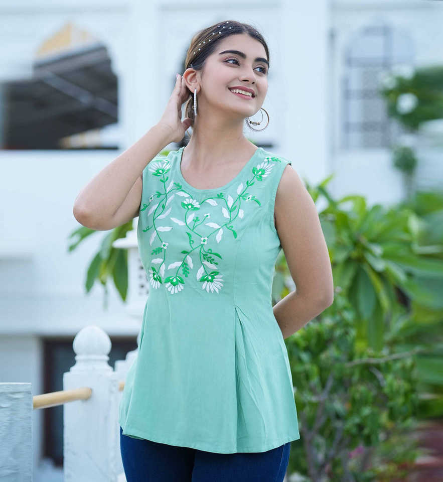 เสื้อแขนกุดทรงปกติสำหรับผู้หญิง สีเขียว ผ้าเรยอน แต่งลายปัก คอทรงกลม ออกแบบมาเพื่อการสวมใส่ลำลองในฤดูร้อนทั่วโลก