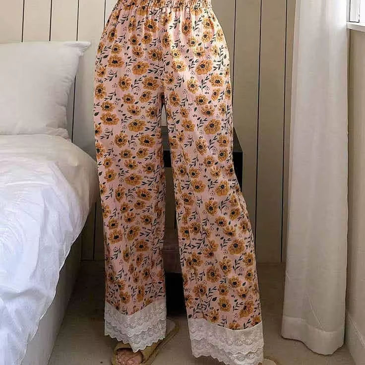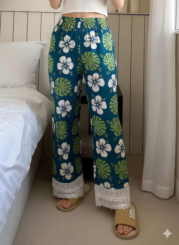 กางเกงขายาวผ้าฝ้ายพิมพ์ลายดิจิตอลทรงหลวมสไตล์ลำลองสำหรับผู้หญิง เอวยางยืด สไตล์โบฮีเมียน เหมาะสำหรับใส่พักผ่อนสบายๆ