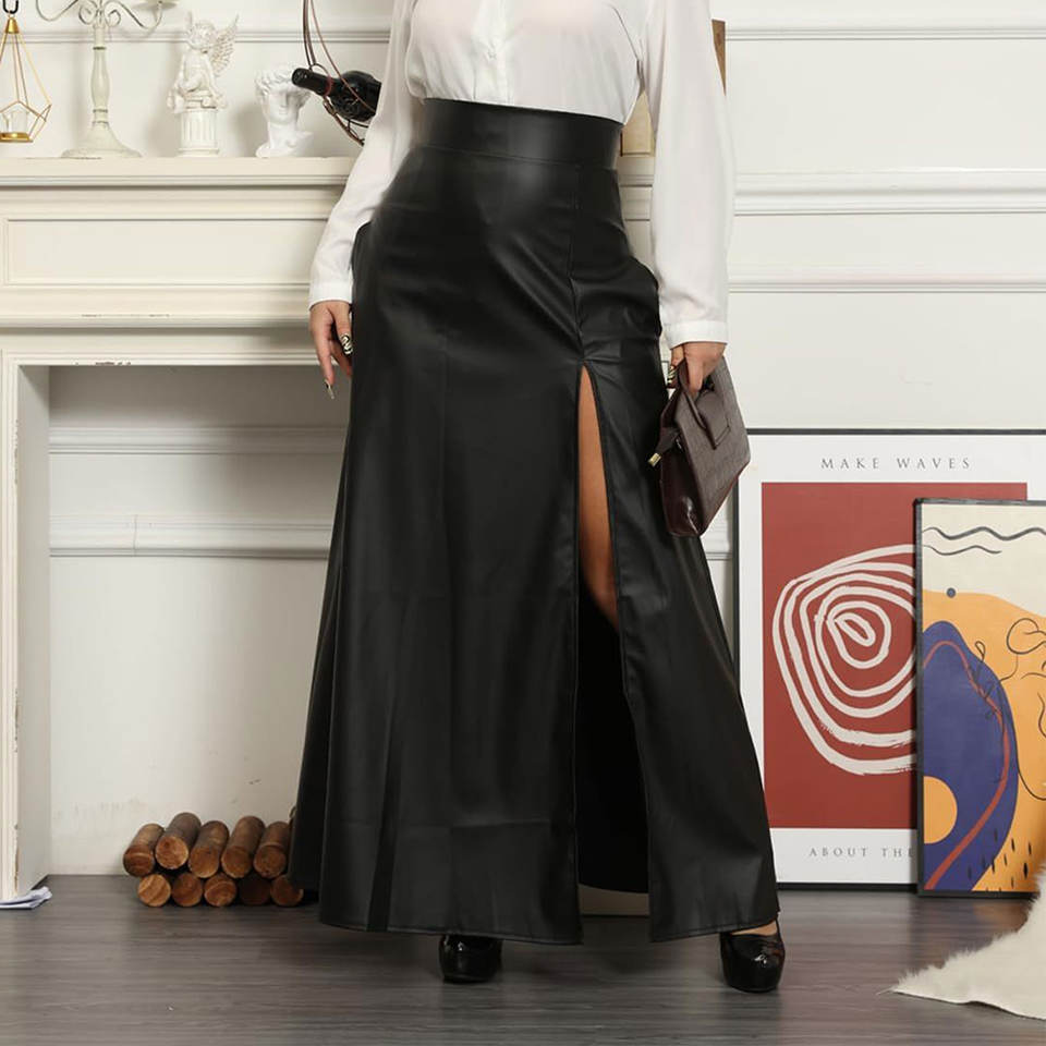 กระโปรงยาวทรงเอ สไตล์วินเทจ หนัง PU เอวสูง เซ็กซี่ ผ่าสูง มีกระเป๋า สำหรับผู้หญิง