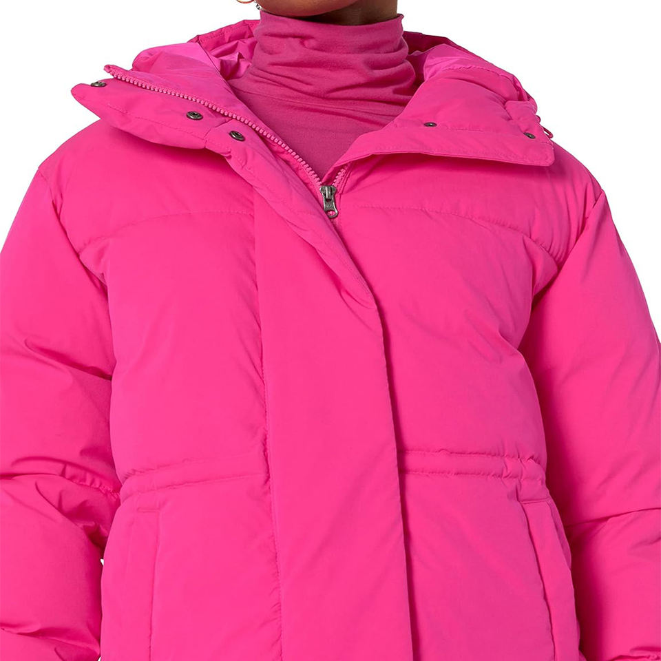 เสื้อแจ็คเก็ตพัฟเฟอร์มีฮู้ดสำหรับผู้หญิง แบบควิลท์บุฉนวนกันหนาว เสื้อโค้ทกันหนาวบุใยอุ่น เสื้อคลุมด้านนอกมีสไตล์ สีชมพูสดใส พร้อมกระดุมแป๊ก