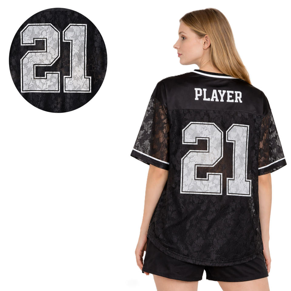 เสื้อเจอร์ซีย์อเมริกันฟุตบอลผู้หญิง ผ้าลูกไม้ตาข่าย ทรงโอเวอร์ไซส์ สตรีทแวร์ คอวี ระบายอากาศได้ดี ผลิตจากโพลีเอสเตอร์ พร้อมหมายเลข รับผลิตตามแบบ OEM