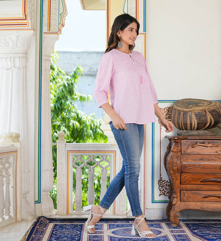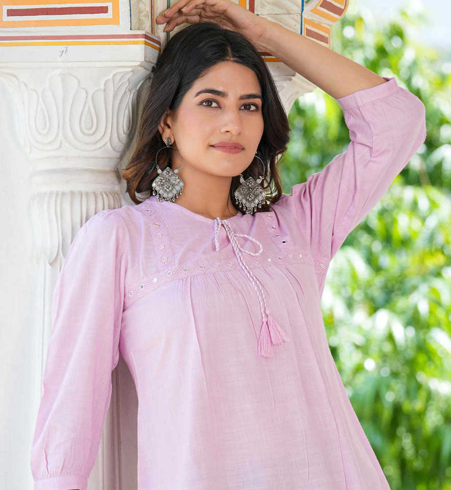 เสื้อท่อนบนผ้าเรยอนสีลาเวนเดอร์สำหรับผู้หญิง ทรงปกติ ปักลาย ตกแต่งด้วยผ้าสลับเนื้อ แขนสามส่วน คอรูรูปหยดน้ำ ดีไซน์สไตล์ลำลองทั่วโลก