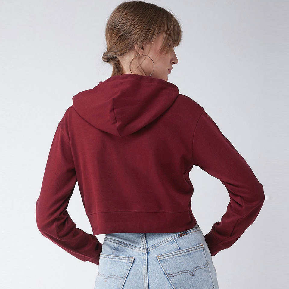 เสื้อฮู้ดครอปสีแดงเลือดหมูสำหรับผู้หญิง ฤดูหนาว ฤดูใบไม้ร่วง เป็นมิตรกับสิ่งแวดล้อม สวมใส่สบาย แขนยาว มีเชือกผูก