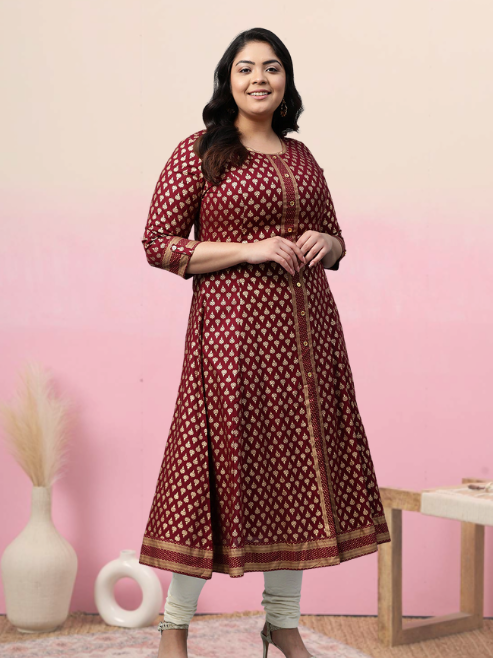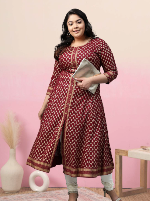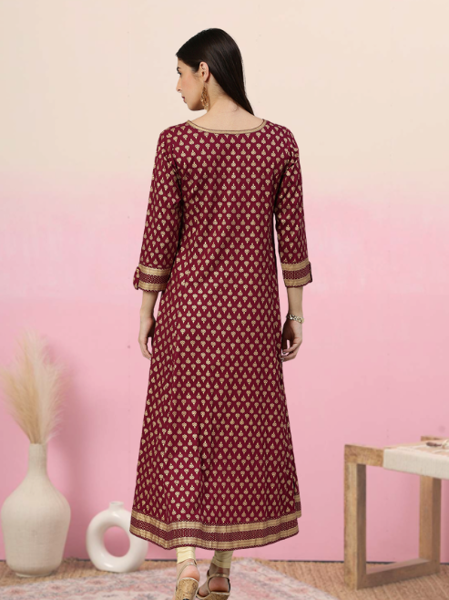 ชุดคุर्ตาทรงเอไลน์สีแดงเลือดหมูสำหรับผู้หญิง ผ้าเรยอนพิมพ์ลายบูติสีทอง คอทรงกลม แขนสามส่วน ออกแบบมาเพื่อการสวมใส่ลำลองสไตล์ชาติพันธุ์ทั่วโลก