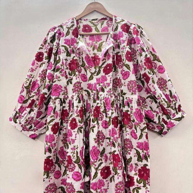 เดรสไหมพรมคอวีสั้นสำหรับผู้หญิง ผ้าฝ้าย 100% ทรงหลวมทันสมัย ระบายอากาศได้ดี ลายดอกไม้สีสันสดใส หวานละมุนเป็นธรรมชาติ