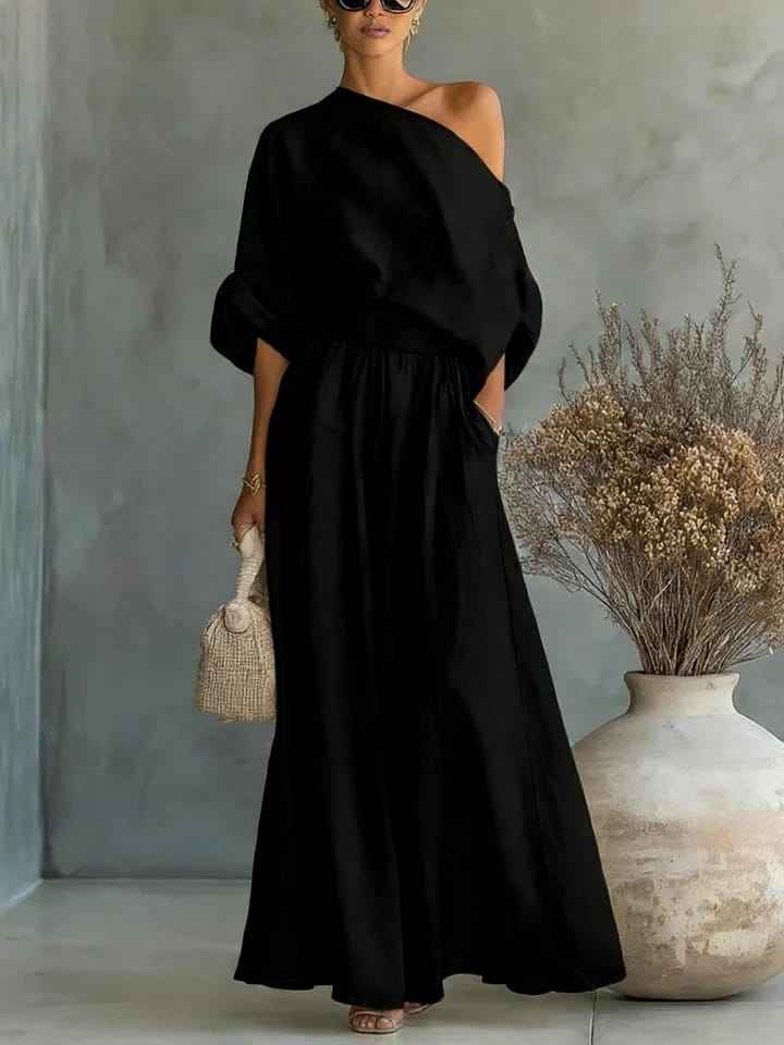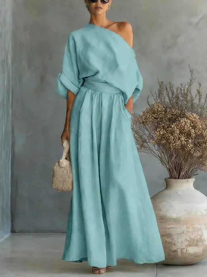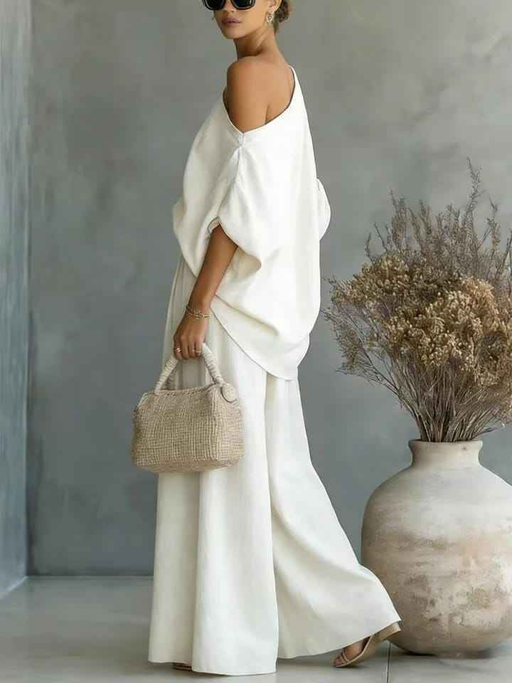 ชุดเซ็ตผ้าลินินแบบมินิมอลสำหรับผู้หญิง เสื้อเปิดไหล่ข้างเดียวและกางเกงฮาเร็มทรงหลวม