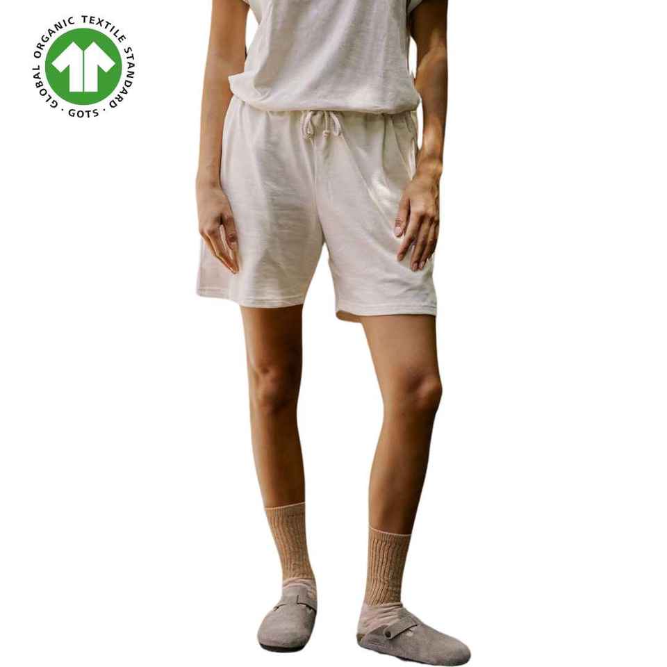 กางเกงขาสั้นกีฬาผ้าคอตตอนออร์แกนิกของผู้หญิงผ้าเจอร์ซี่5.4ออนซ์เนื้อผ้านุ่มระบายอากาศได้ดีมีสายรัดเอวยืดได้
