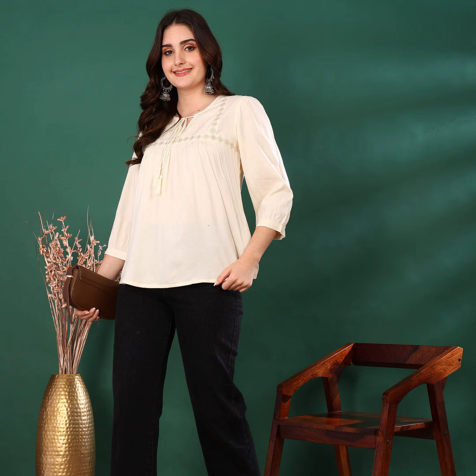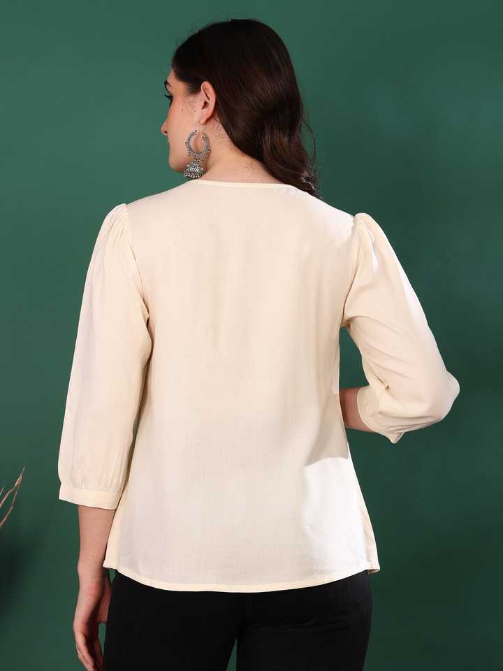 เสื้อท่อนบนผ้าเรยอนสีพีชสำหรับผู้หญิง ทรงปกติ ปักลาย ตกแต่งด้วยแขนสามส่วนและคอรูรูปทรงกุญแจ ออกแบบมาเพื่อการสวมใส่ลำลองแบบสากล