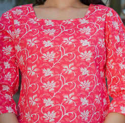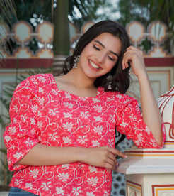 เสื้อผู้หญิงสีชมพูผ้าฝ้ายพิมพ์ลายดอกไม้ทรงปกติ แขนพองสามชั้น คอทรงเหลี่ยม ดีไซน์ลำลองสไตล์โลก