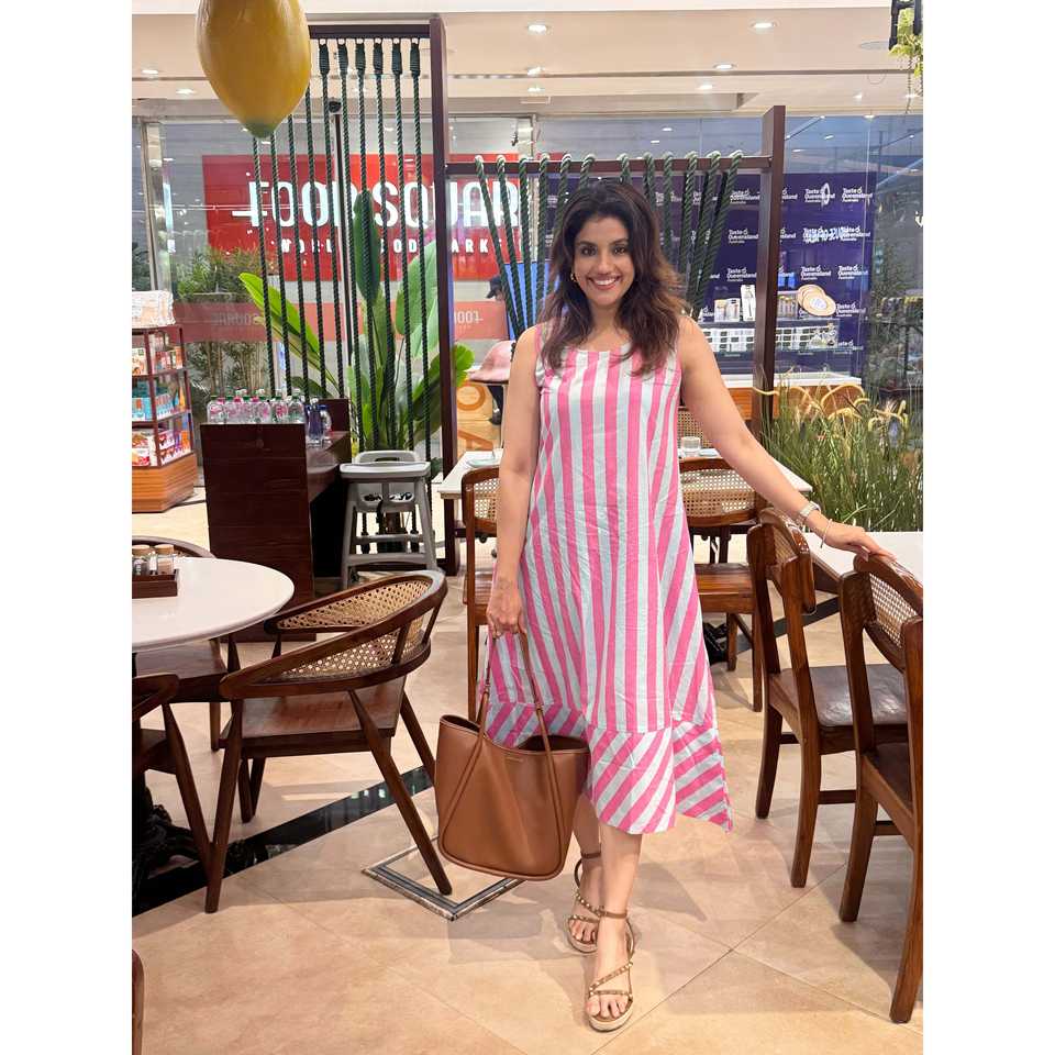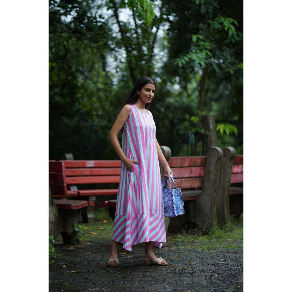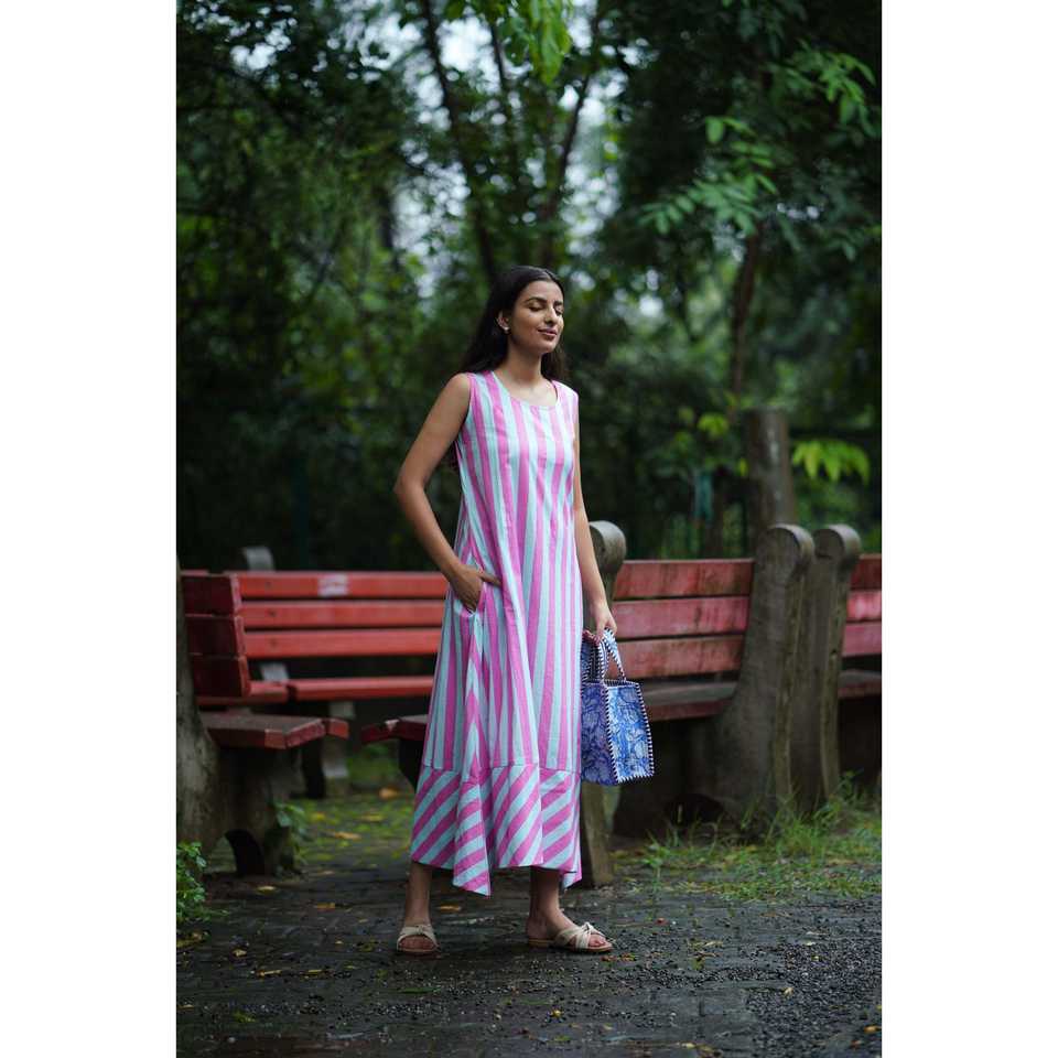 ชุดเดรสแม็กซี่แขนกุดลายทางสีชมพูขาวสำหรับผู้หญิงลำลองทรงหลวมฤดูร้อนทรงเอไลน์น้ำหนักเบาสำหรับวันหยุดสวมใส่ทุกวัน 100%