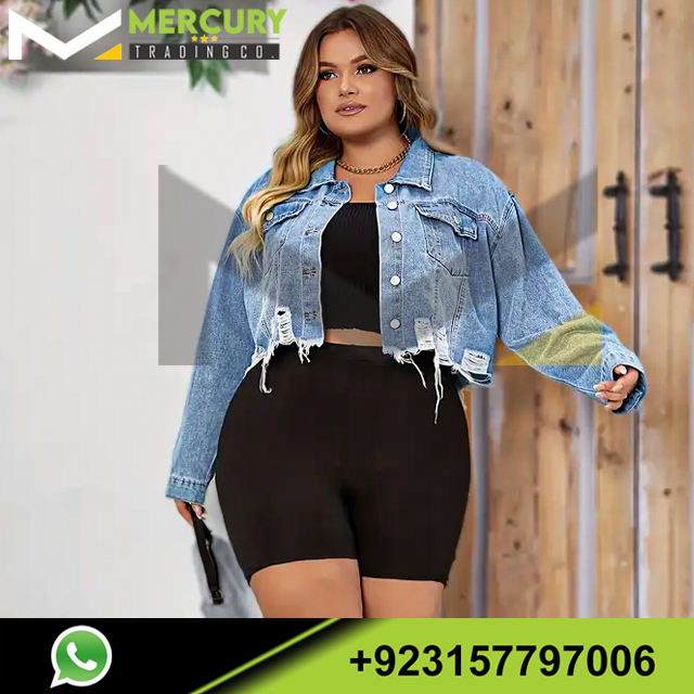 Womens Plus Size Casual Denim Jacket Womens Breathable Raw Trim Long Sleeve Button up Lapel Collar Crop Denim Jacket