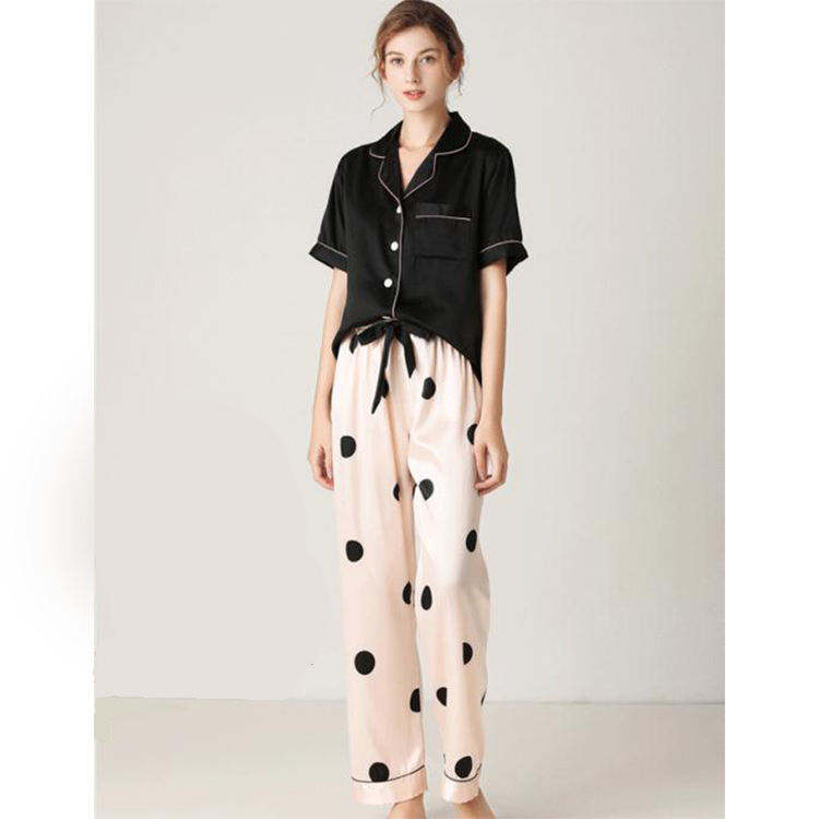 ชุดนอนผ้าซาตินลายจุดสำหรับผู้หญิง ชุดสองชิ้น กระดุมหน้า แขนยาว