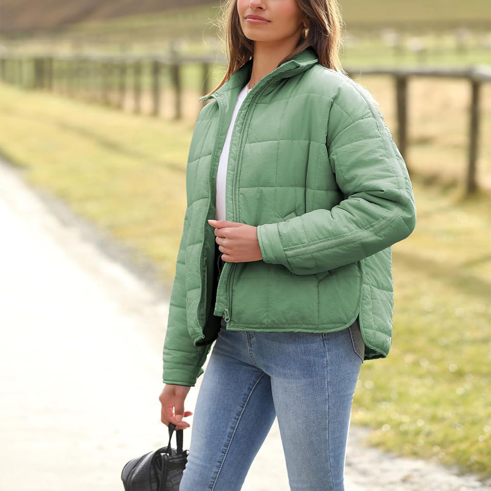 เสื้อแจ็คเก็ตผู้หญิงแบบควิลท์ คอเต่า แจ็คเก็ตฤดูหนาวบุใยอุ่น แจ็คเก็ตพัฟฟี่สีเขียวเซจทันสมัย พร้อมซิปยาว