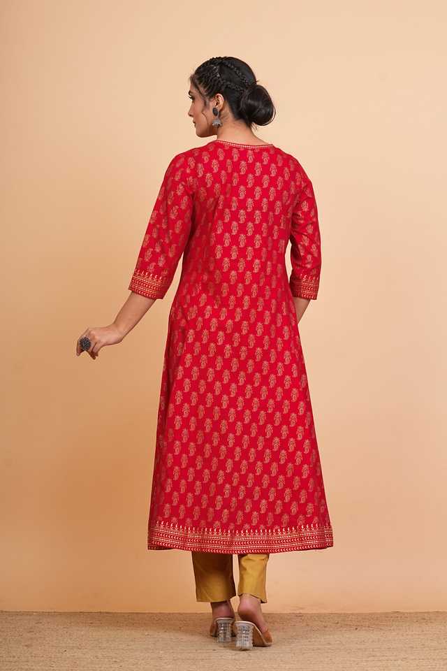ชุดอานาร์กาลีคุรตะผ้าฝ้ายสีแดงพิมพ์ลายดอกไม้สำหรับผู้หญิง พร้อมผ้าคลุมไหล่ ความยาวระดับน่อง คอกลม แขนสามส่วน ดีไซน์สไตล์ชาติพันธุ์ทั่วโลก