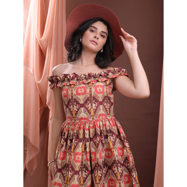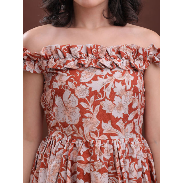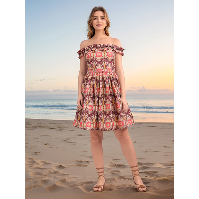 เดรสสั้นเปิดไหล่พิมพ์ลายดอกไม้สีสนิมสำหรับผู้หญิงชุดเดรสผ้าฝ้ายแขนกุดผสมดีไซน์พื้นเมืองมีระบาย