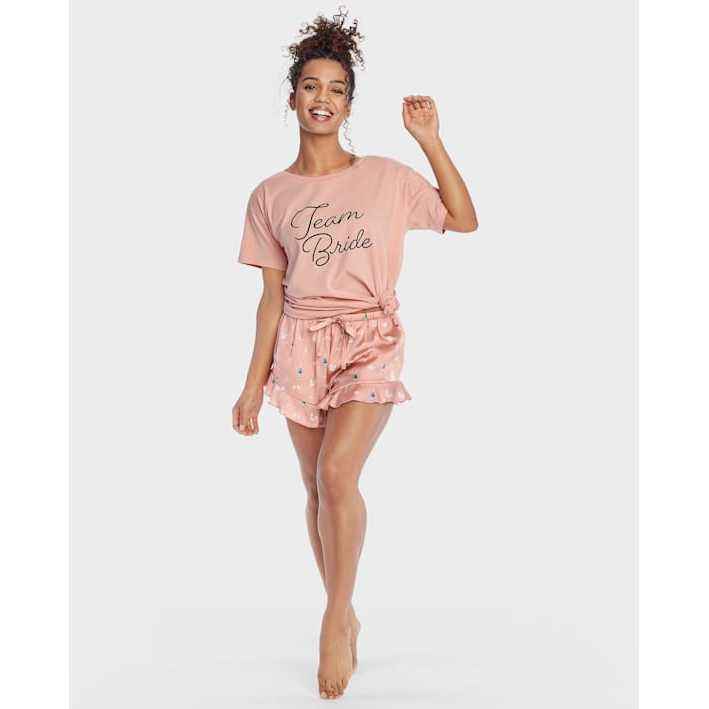 ชุดนอนผ้าซาตินสำหรับผู้หญิงกางเกงขาสั้นสีชมพูมีระบายสำหรับเจ้าสาวเอวยางยืดมีขนาดเดียวระบายอากาศได้ดีผ้าสแปนเด็กซ์สำหรับกลางคืน