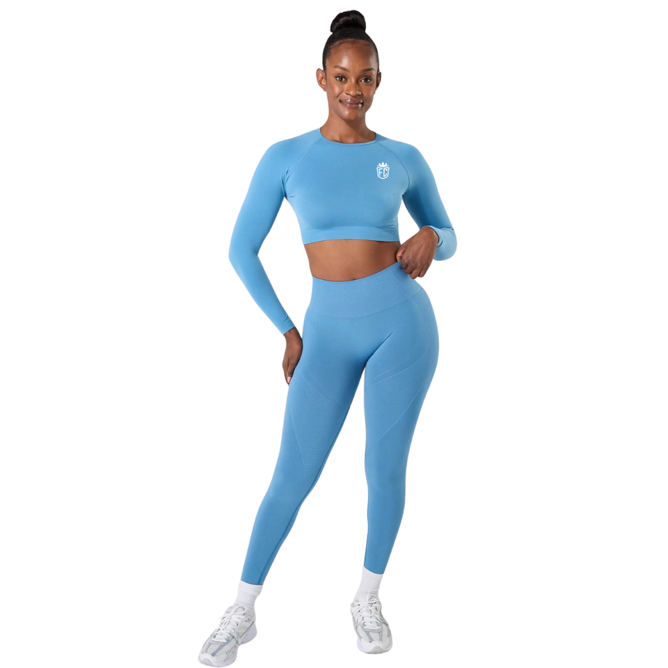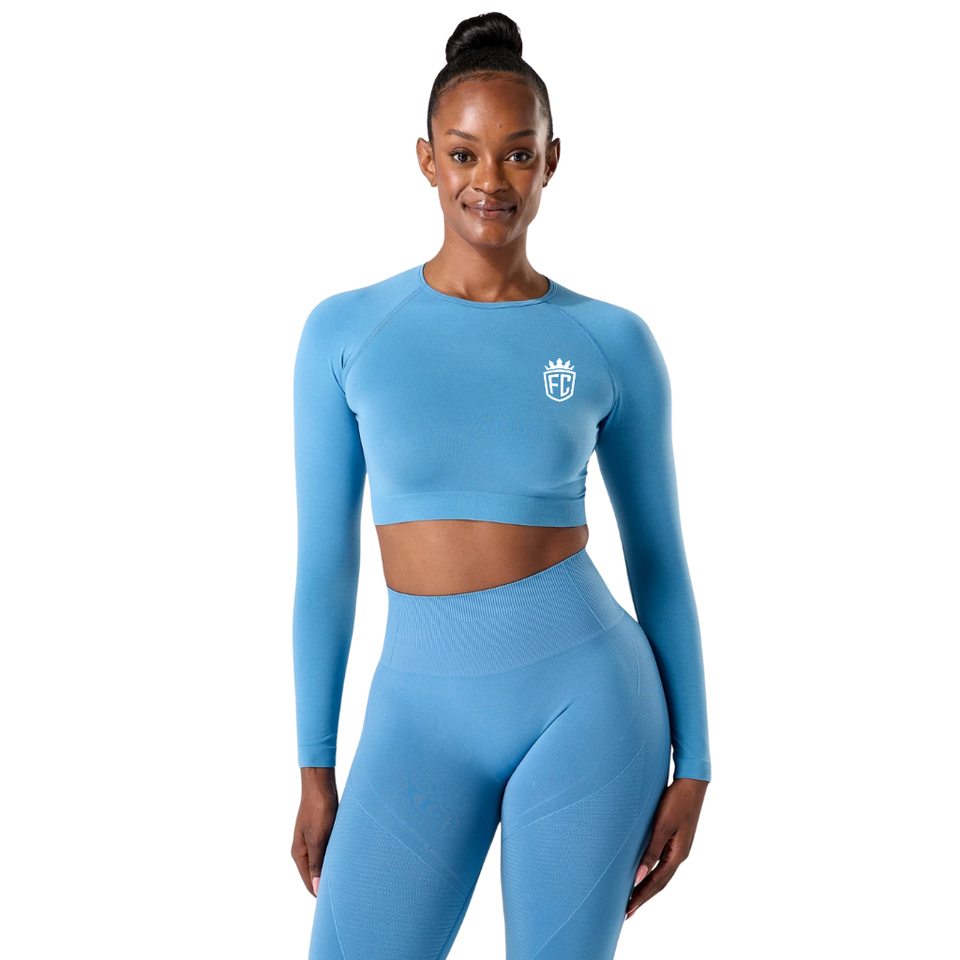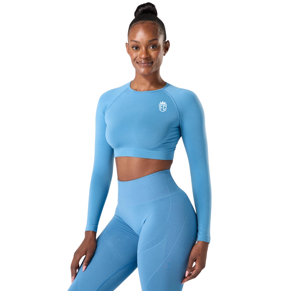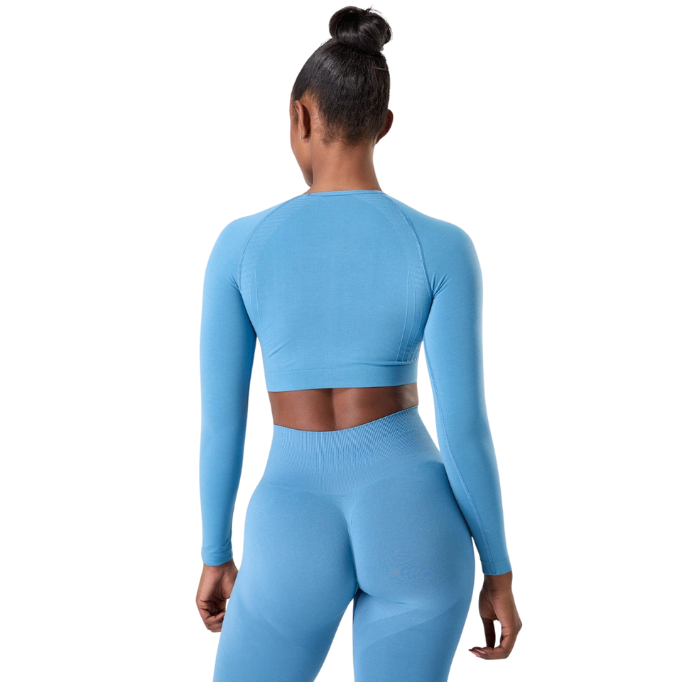 เสื้อครอปแขนยาวไร้ตะเข็บสำหรับผู้หญิง สีฟ้าโคสตัล ทรงเข้ารูป สำหรับออกกำลังกาย โยคะ ชุดกีฬา และชุดลำลอง