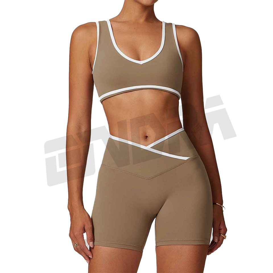 Womens Seamless Yoga Set Sports Bra Quick Dry Cross Waistband Butt Lifting Shorts Nude Feel Contrast Trim Activewear 2025 Trend