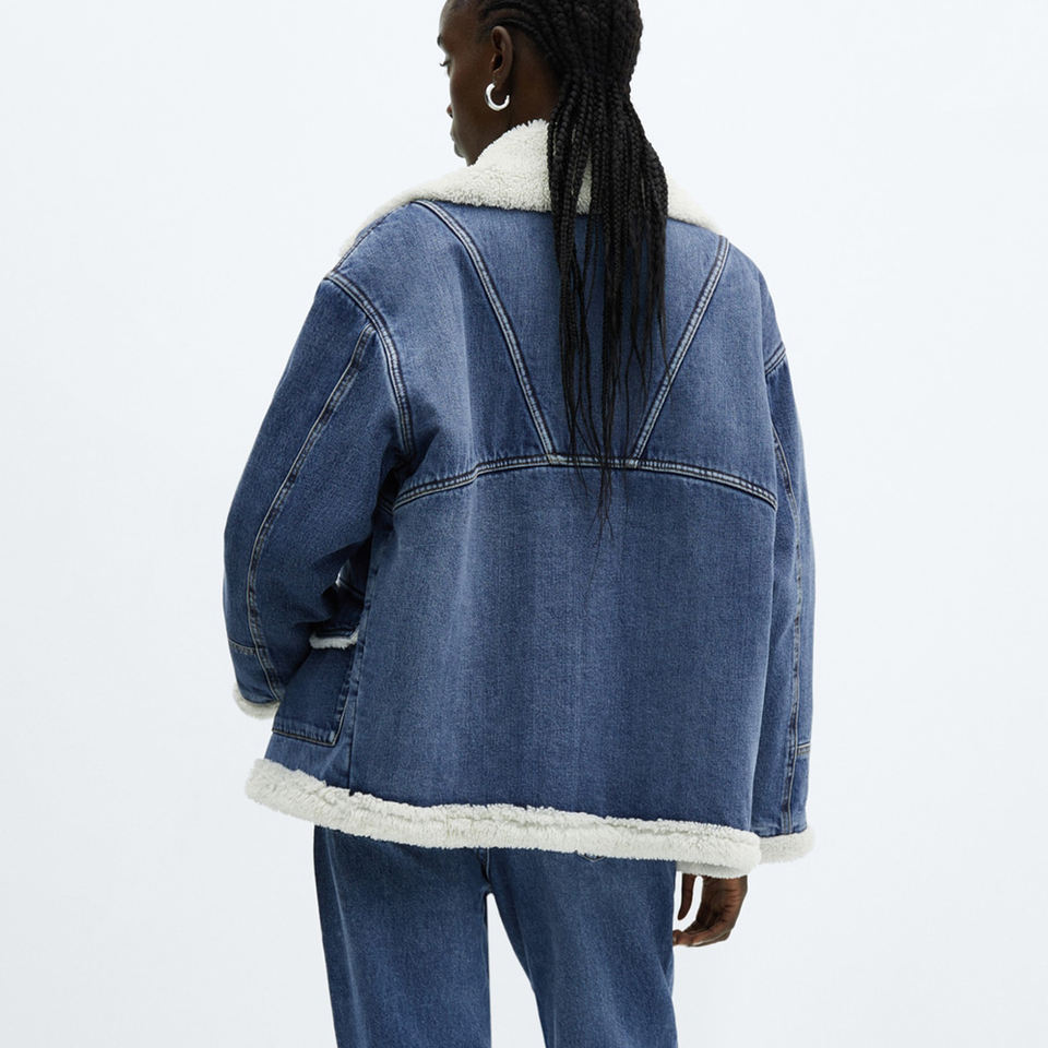 เสื้อแจ็คเก็ตยีนส์บุขนเชอร์ปาสำหรับผู้หญิง สีน้ำเงิน ให้ความอบอุ่นสบาย พร้อมปกขนสัตว์เทียม สไตล์ลำลองสำหรับฤดูหนาว เหมาะสำหรับใส่เป็นเสื้อคลุมทับ