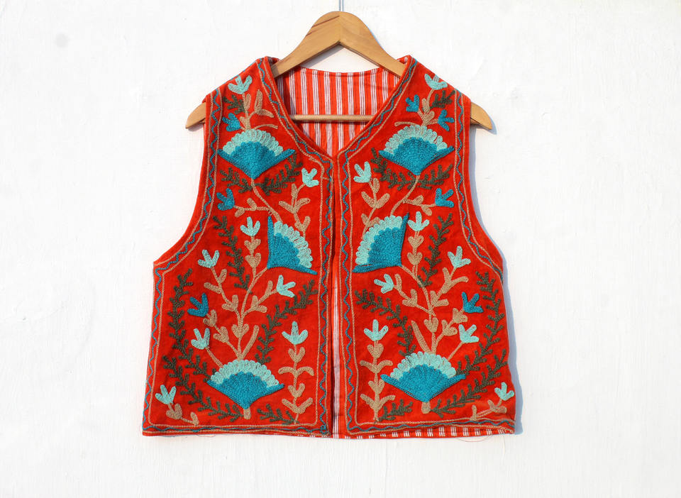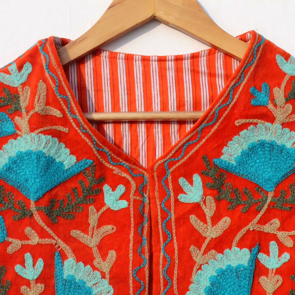 เสื้อกั๊กกำมะหยี่ปักลายดอกซูซานีสำหรับผู้หญิง แขนกุด ผ้าฝ้าย บุใยฝ้าย ความยาวสั้น เหมาะสำหรับฤดูหนาว