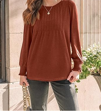 เสื้อแขนยาวสีน้ำตาลเข้มของผู้หญิงชุดเดรสยาวปกติลำลองด้านหน้ามีจีบคอกลมดีไซน์ด้านหน้า