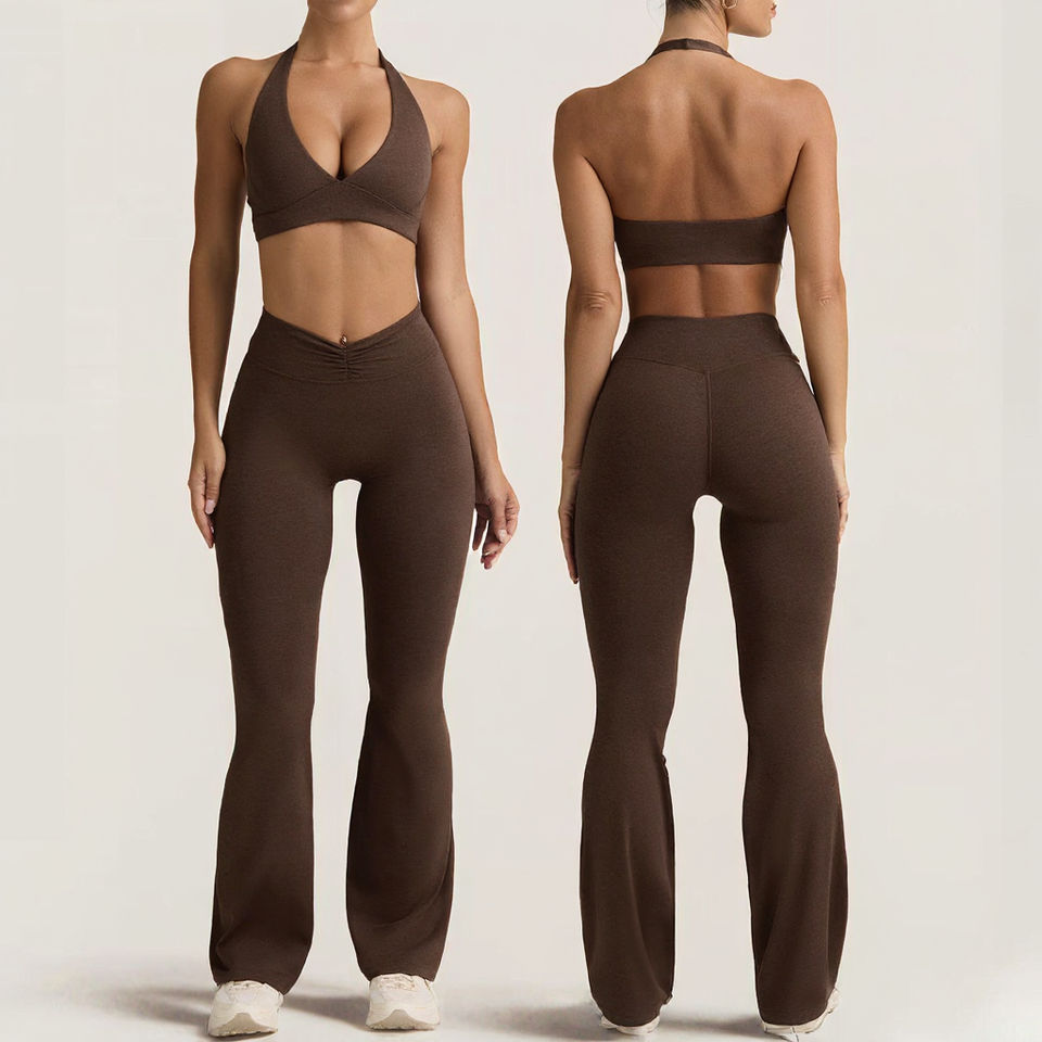 ชุดบราและกางเกงโยคะเอวสูงทรงขาบาน คอวี ผ้าเนื้อเดียวกัน ยืดหยุ่นได้ดี เหมาะสำหรับออกกำลังกายและเล่นกีฬา