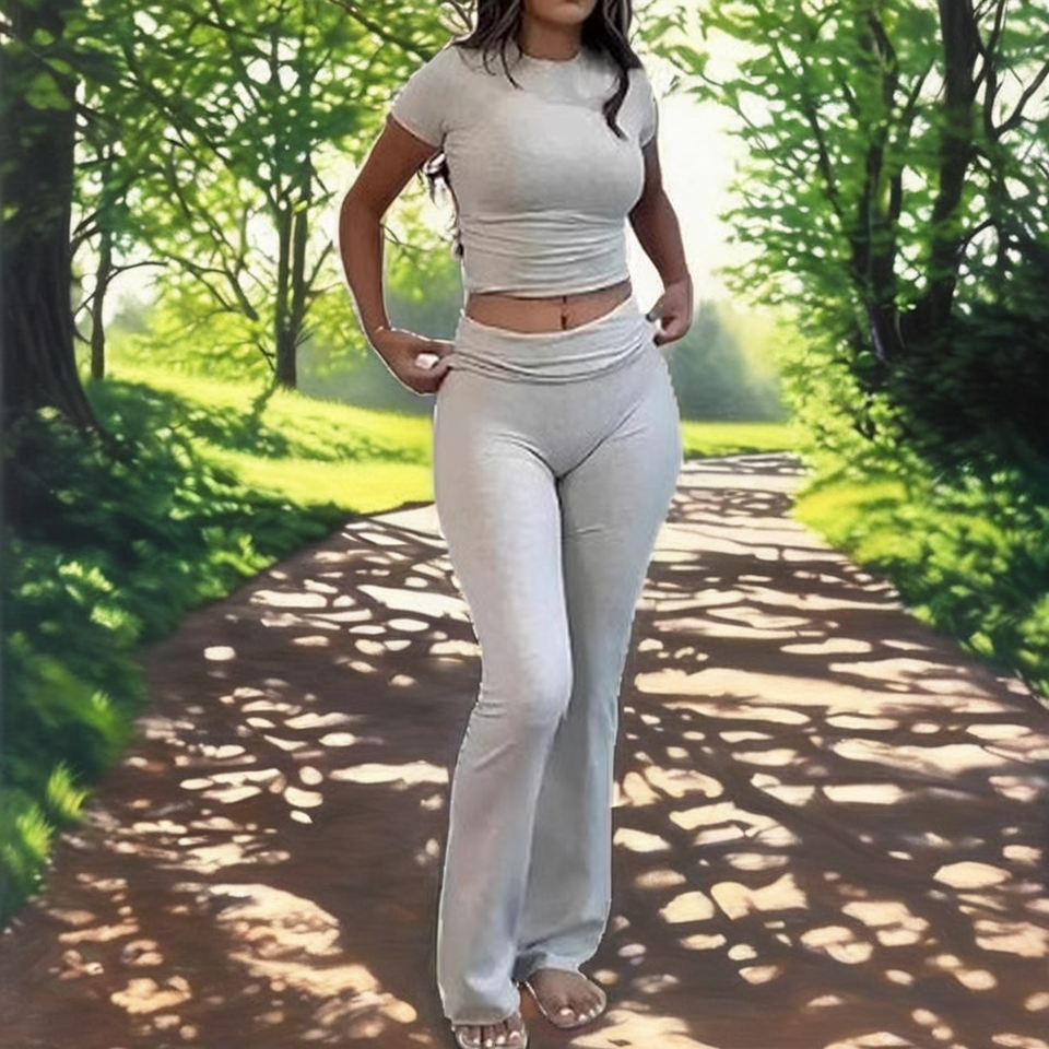 ชุดเซ็ทเสื้อแขนสั้นทรงเข้ารูปสีพื้นสำหรับผู้หญิง กางเกงเลกกิ้งขาบานเอวต่ำ ยืดหยุ่น กันลม เหมาะสำหรับออกกำลังกาย เล่นกีฬา ผ้าสแปนเด็กซ์ 1 ชิ้น