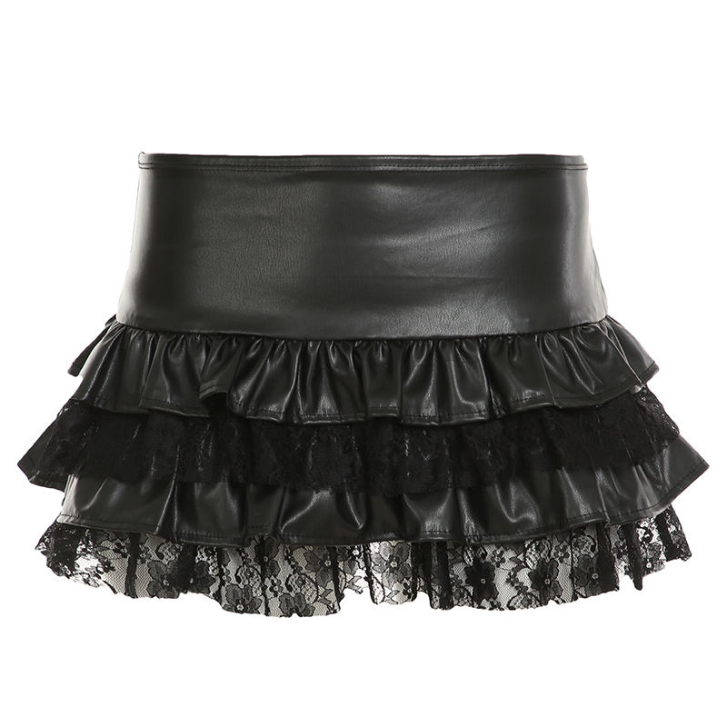 กระโปรงมินิสตรีทสไตล์โกธิคสีเข้มสำหรับผู้หญิง ทำจากหนัง PU แต่งลูกไม้เป็นชั้นๆ เอวธรรมชาติ ระบายอากาศได้ดี เป็นมิตรกับสิ่งแวดล้อม