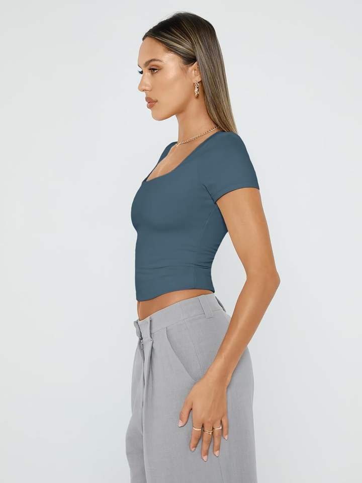 เสื้อครอปแขนสั้นสำหรับผู้หญิงเสื้อยืดถักลายน่ารักและสีพื้นสำหรับใส่ฤดูร้อน