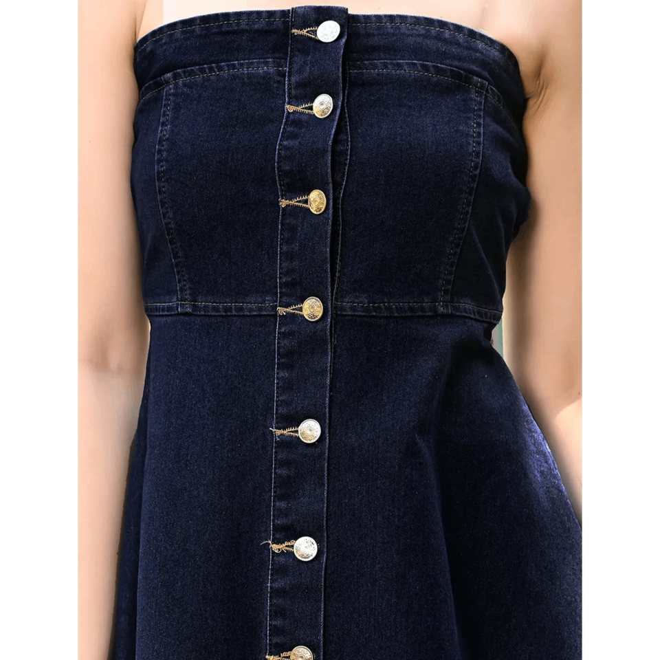 เดรสยีนส์ทรงเอไลน์แบบไม่มีสายรัดไหล่ ติดกระดุมด้านหน้า คอรูปหัวใจ สีอินดิโก้ แต่งชายระบาย ความยาวปานกลาง