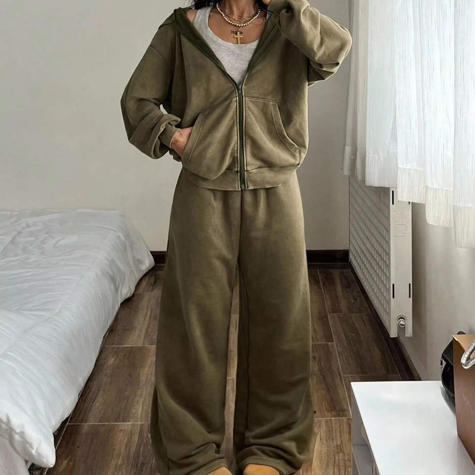 ชุดเซ็ตเสื้อฮู้ดซิปและกางเกงขายาวผ้าฟลีซสองชิ้นสำหรับผู้หญิง สวมใส่สบายๆ แบบลำลอง