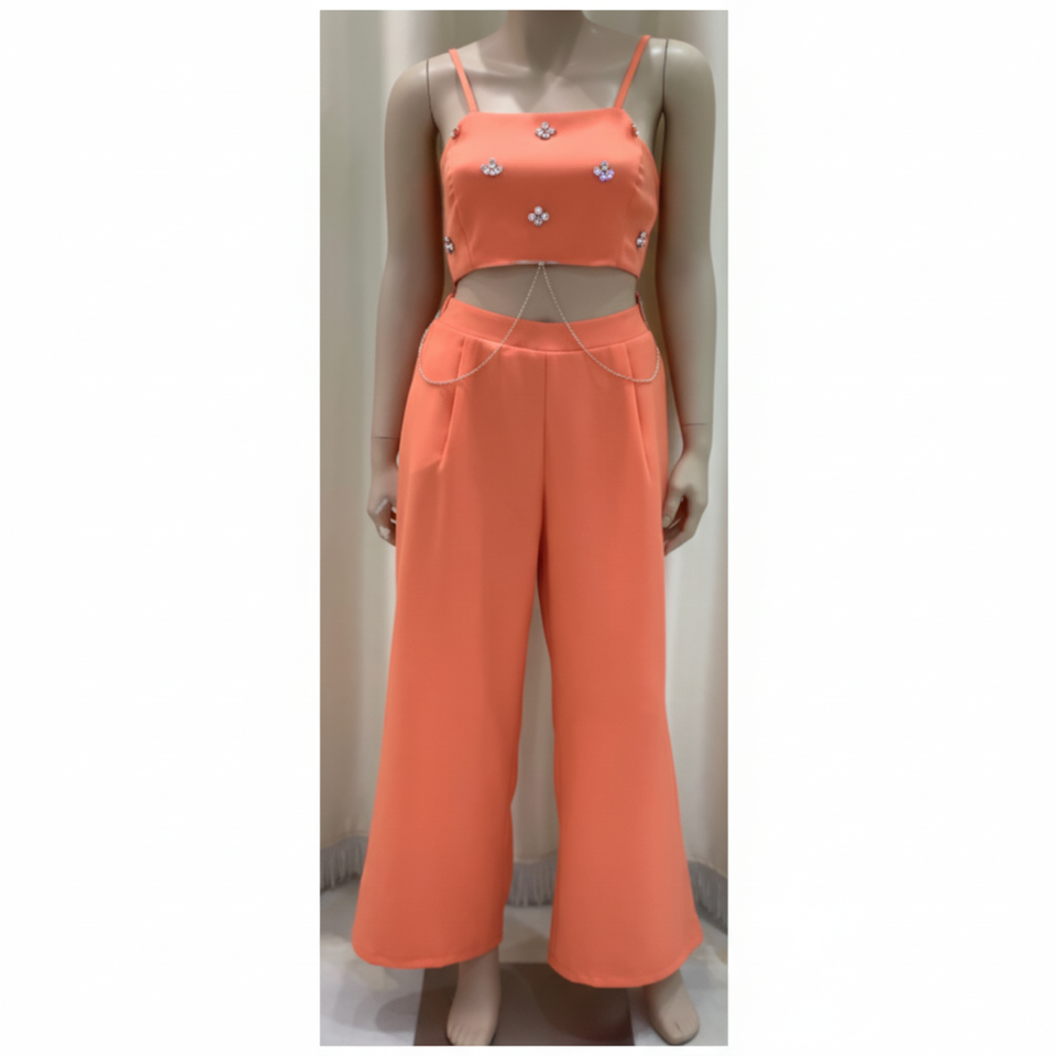 Womens Two-Piece Outfit Set with Embroidered Crop Top and Wide-Leg Pants