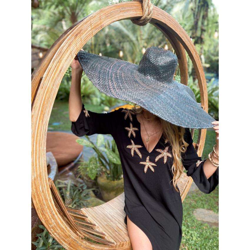 ชุดเดรสชายหาดสีดำคอวีสำหรับผู้หญิง ปักลายปลาดาว แขนเสื้อแบบหรูหรา เหมาะสำหรับใส่เที่ยวพักผ่อนช่วงฤดูร้อน