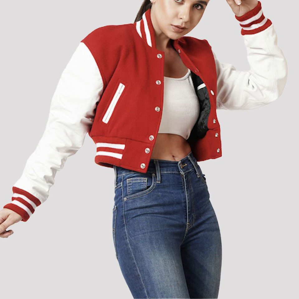 แจ็คเก็ตนักเบสบอลของผู้หญิงสีแดงและสีขาวเสื้อแจ็กเก็ตมีแขนเสื้อหนัง PU ผลิตตามสั่ง