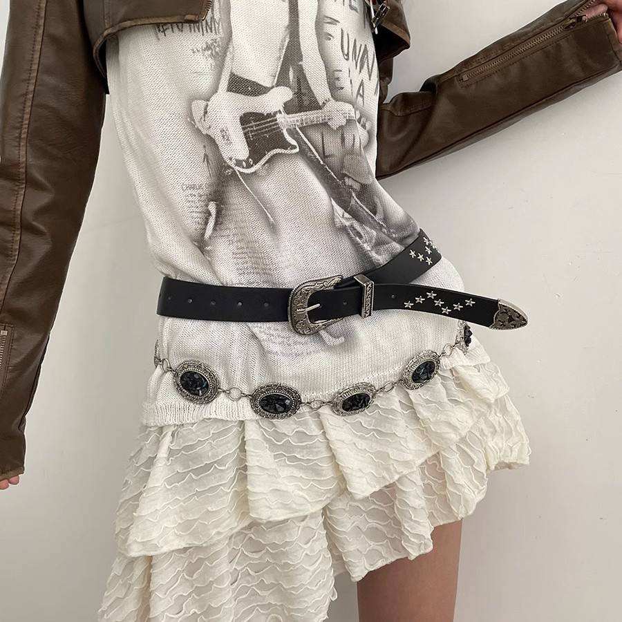 เข็มขัดหนัง PU สไตล์วินเทจสำหรับผู้หญิงหัวเข็มขัดอัลลอยหมุดพังค์ร็อคสำหรับกางเกงยีนส์สไตล์ลำลองคลาสสิก