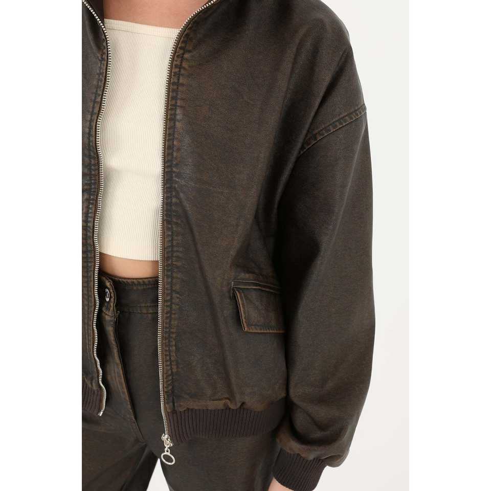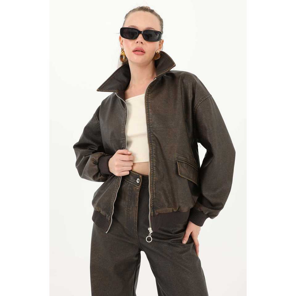 เสื้อแจ็คเก็ตบอมเบอร์หนังวัวแท้สำหรับผู้หญิง สีน้ำตาล แขนยาว สไตล์ฤดูใบไม้ร่วง