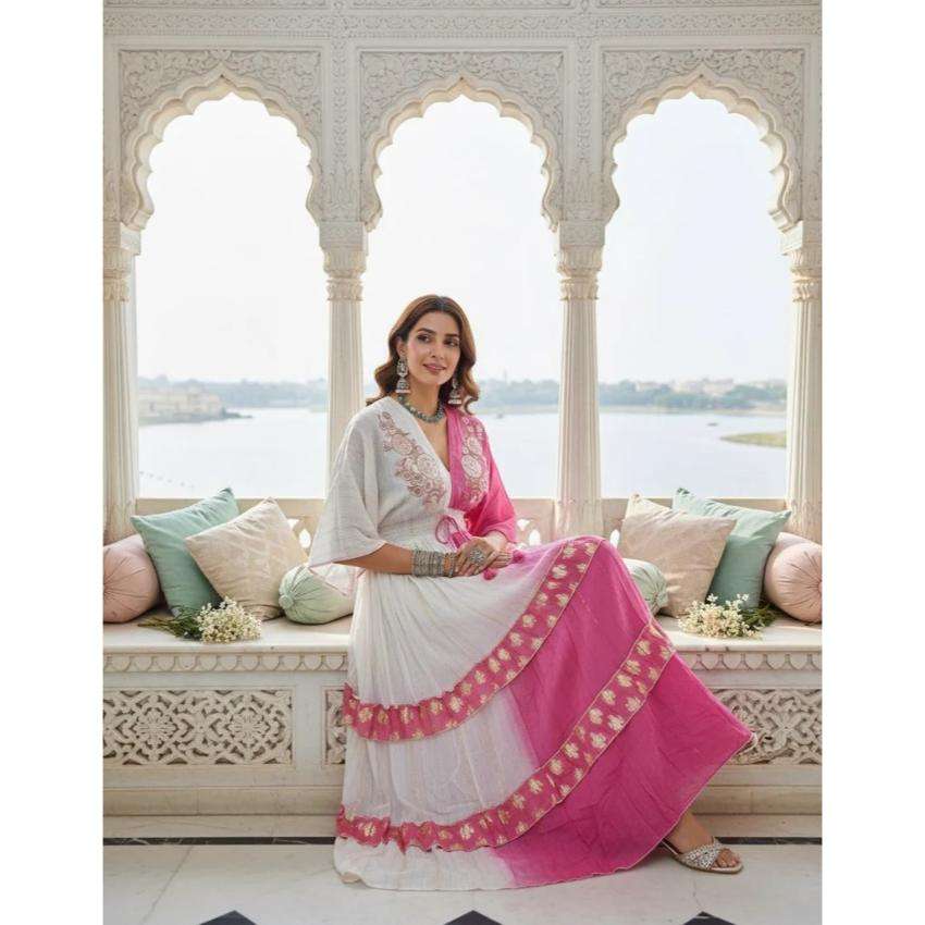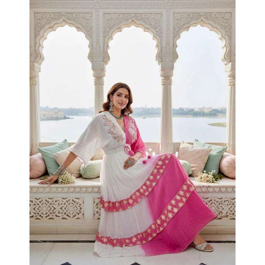 ชุดเดรสอนาร์กาลีสีขาวชมพูแบบหลายชั้นสำหรับผู้หญิง พร้อมผ้าคลุมไหล่ ชุดงานเทศกาลแบบอินเดีย ชุดงานเลี้ยงหรูหราสำหรับงานแต่งงาน