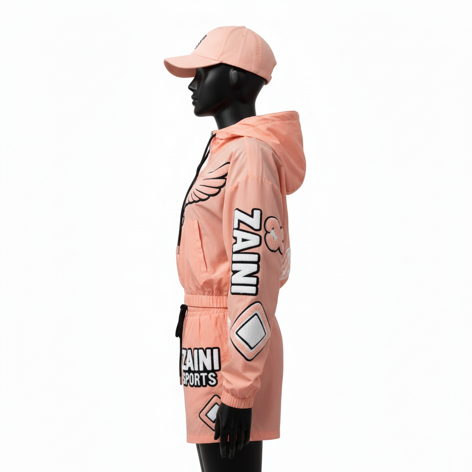 ชุดเซ็ตเสื้อแจ็คเก็ตกันลมและกางเกงขาสั้นสำหรับผู้หญิง ผ้าโพลีเอสเตอร์ทอระบายอากาศ สีพีช ปักโลโก้เชนิลล์ตามสั่ง ชุดเซ็ตเสื้อแจ็คเก็ตกันลมและกางเกงขาสั้น ไซส์พลัส