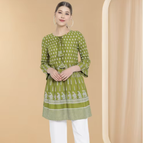 ชุดคุर्ติสั้นผ้าเรยอนพิมพ์ลายดอกไม้สีเขียวสำหรับผู้หญิง ดีไซน์คอรูเล็กและแขนสามส่วนเพื่อความสวมใส่สบาย