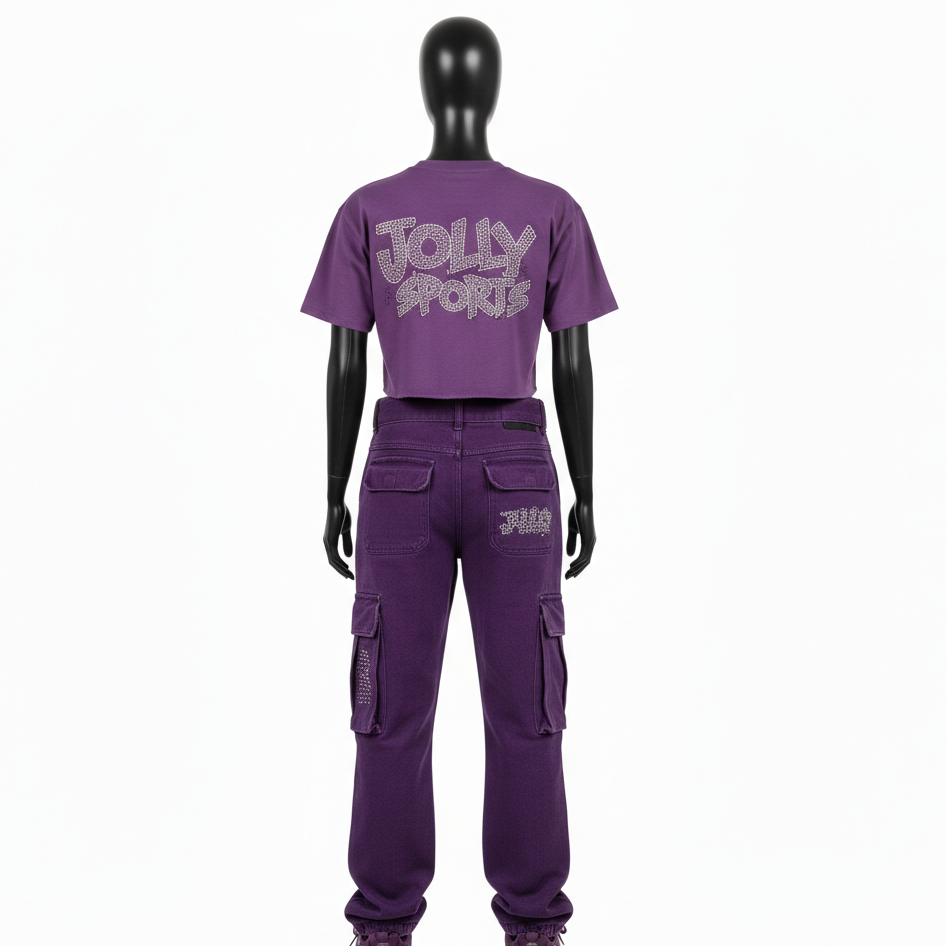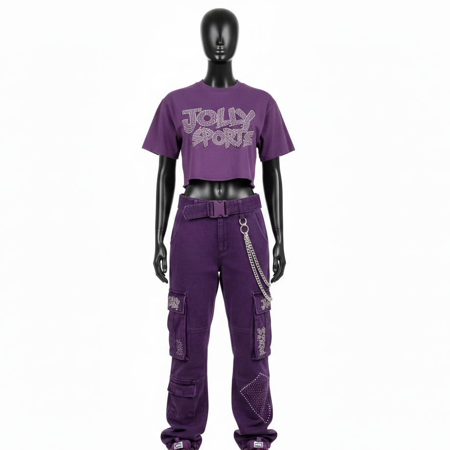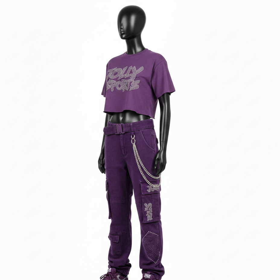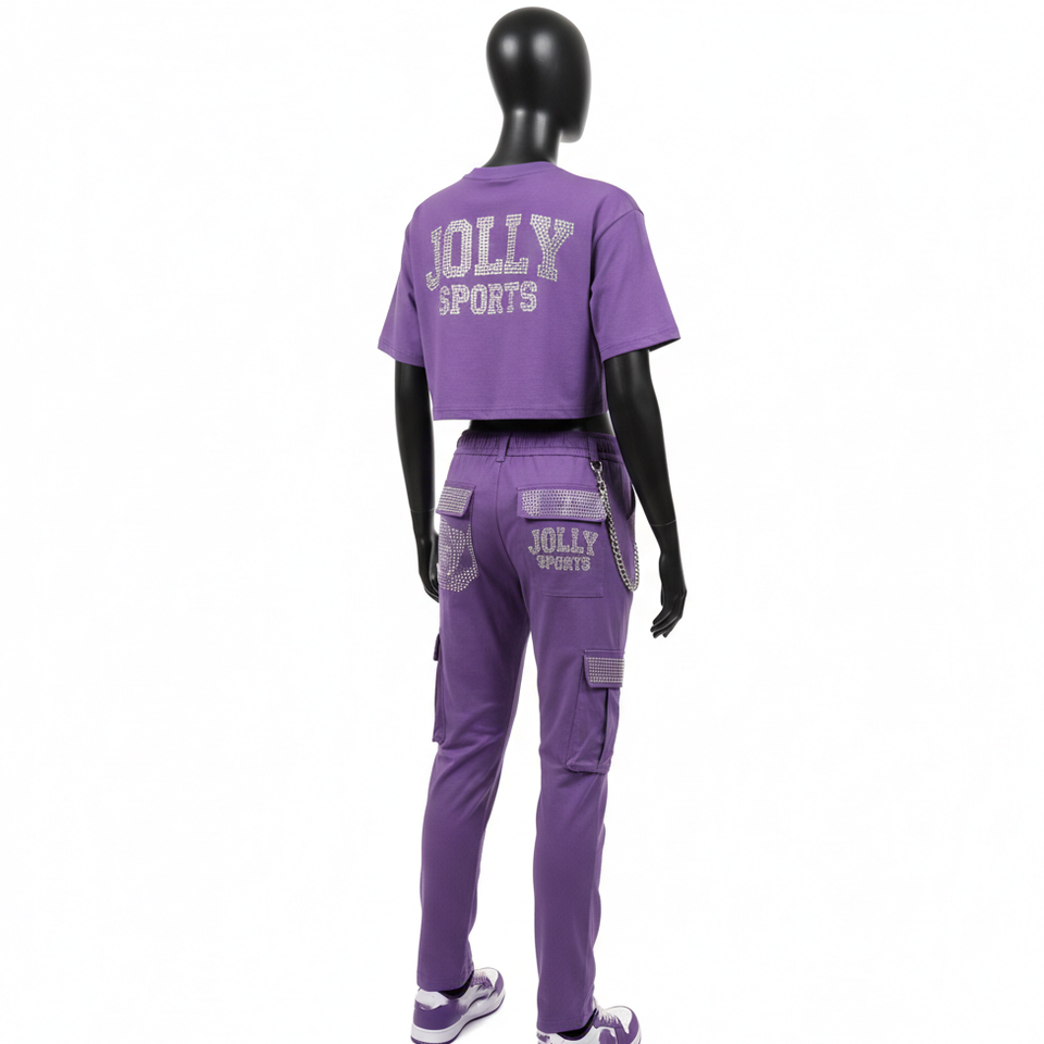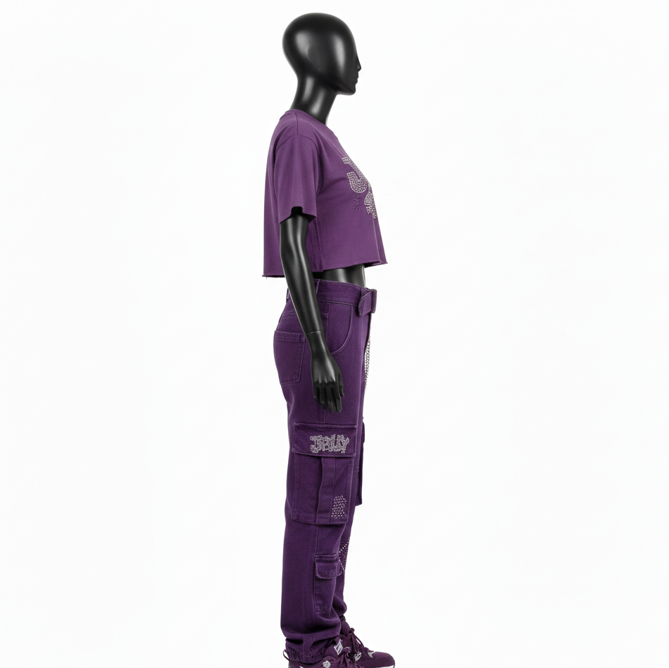 ชุดเซ็ตผู้หญิง เสื้อครอปสีม่วงผ้าฝ้ายโพลีเอสเตอร์เฟรนช์เทอร์รี่ 240 GSM พรีเมียม พร้อมกางเกงคาร์โก้ แต่งโลโก้ด้วยคริสตัล