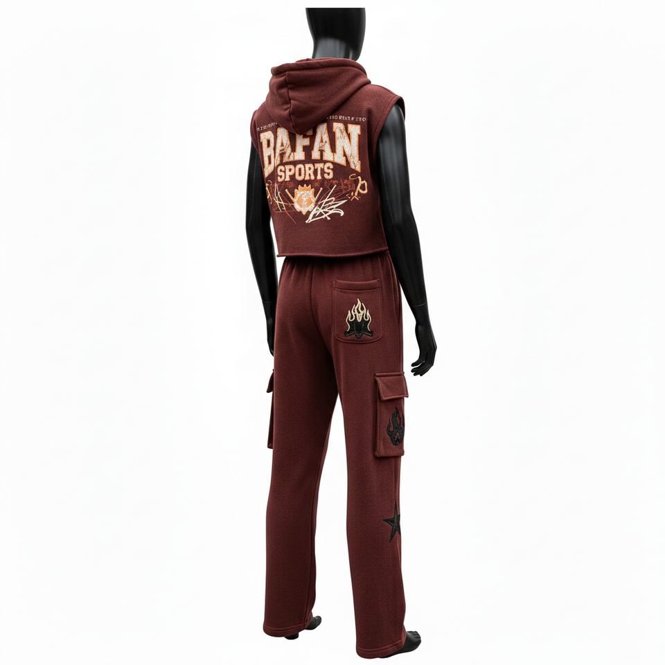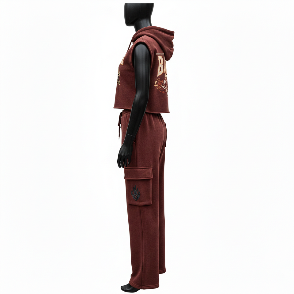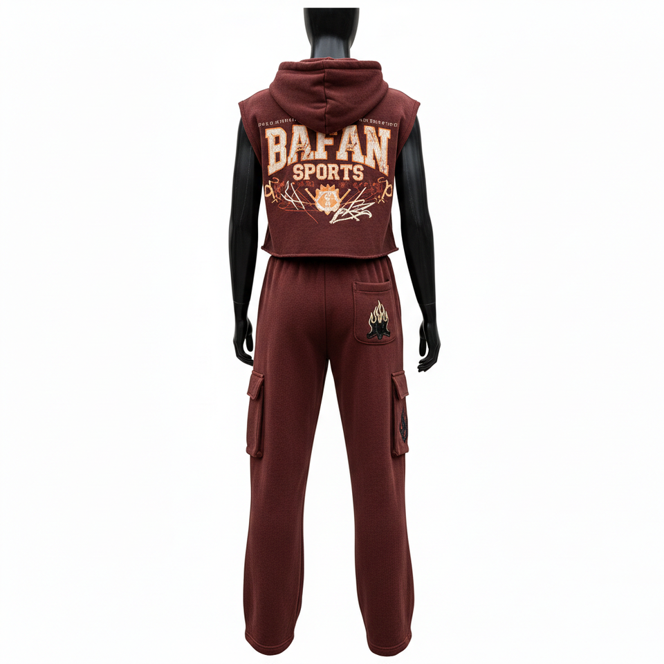 ชุดเซ็ตเสื้อฮู้ดแขนกุดผ้าฝ้ายผสมโพลีเอสเตอร์สีแดงไวน์พร้อมกางเกงคาร์โก้สำหรับผู้หญิง รับสกรีนโลโก้ปักลายตามสั่ง
