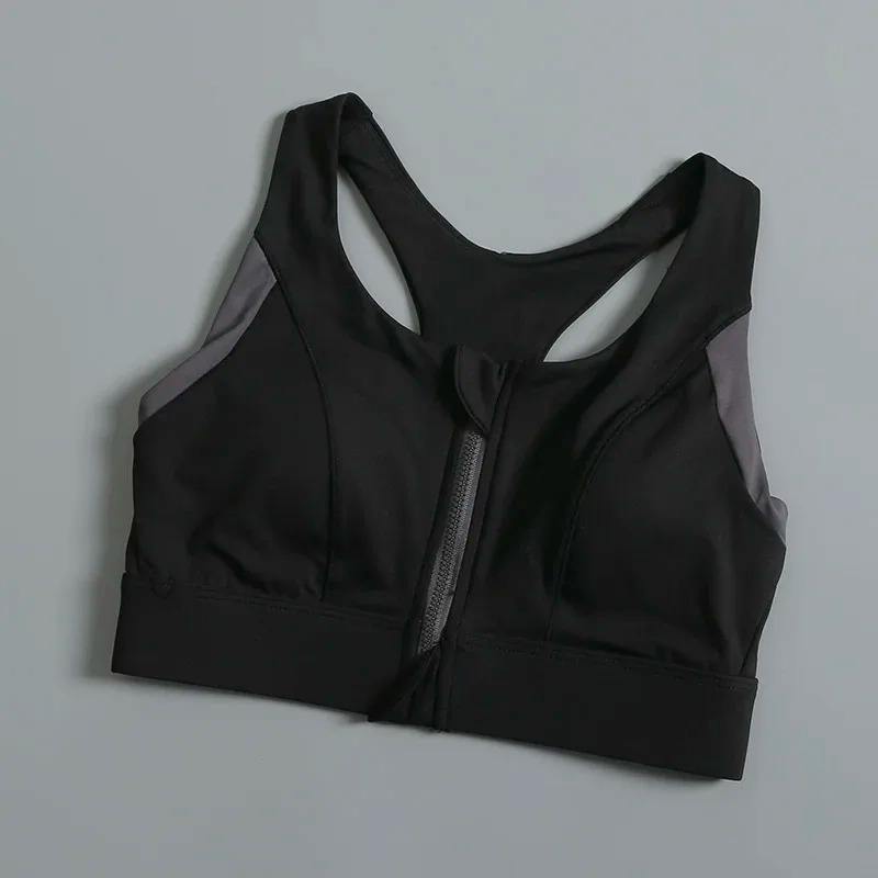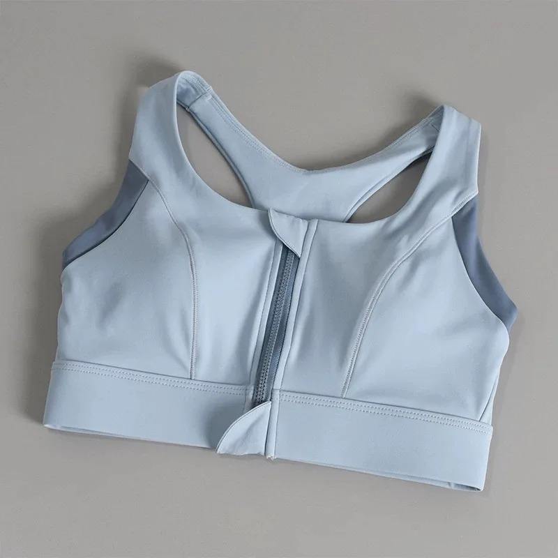 Womens sports and fitness bra with contrasting color design shock-absorbing and gathered front zipper