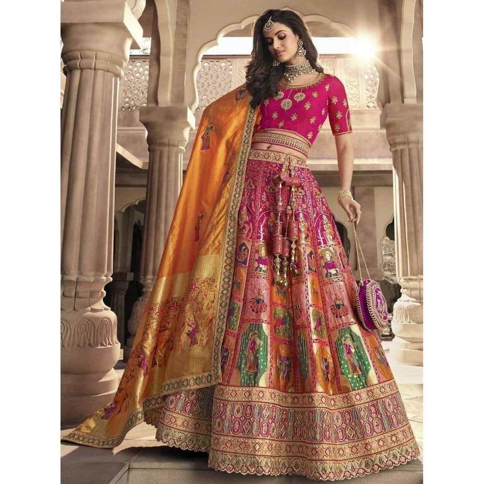 ชุดเลเฮนกาโชลีงานแต่งงานผ้าไหมบานาราซีปักลายซารีสีส้ม-รานี น่ารัก สวยงาม น้ำหนัก 6 กก. สำหรับโอกาสพิเศษ