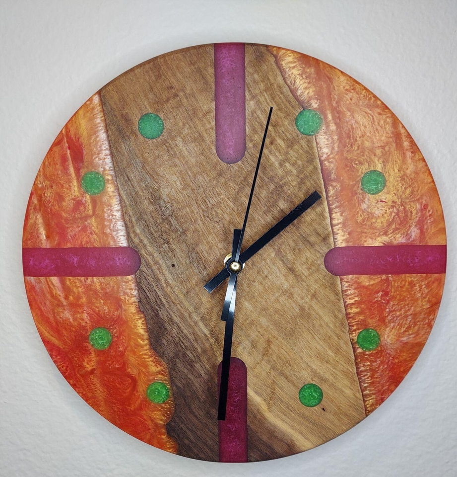 นาฬิกาแขวนผนังไม้และเรซินสีส้ม/ชมพู/เขียวทรงกลมนาฬิกาไม้ติดผนังแบบเรียบง่ายสินค้าตกแต่งด้วยมือ