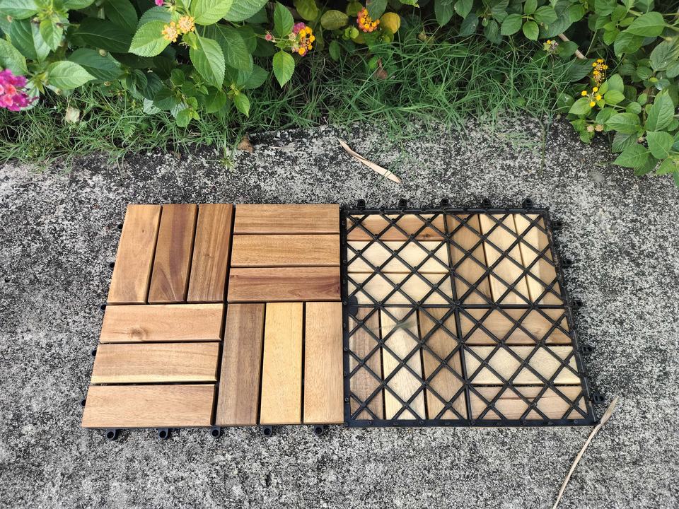 กระเบื้องพื้นระเบียงสำเร็จรูป 3 ชั้น ทำจากไม้แอคาเซียผสมพลาสติก ลายไม้ขัดแบบโมเดิร์น ขนาด 300*300 มม. ติดตั้งแบบคลิ๊กล็อค ใช้ได้ทั้งภายในและภายนอก
