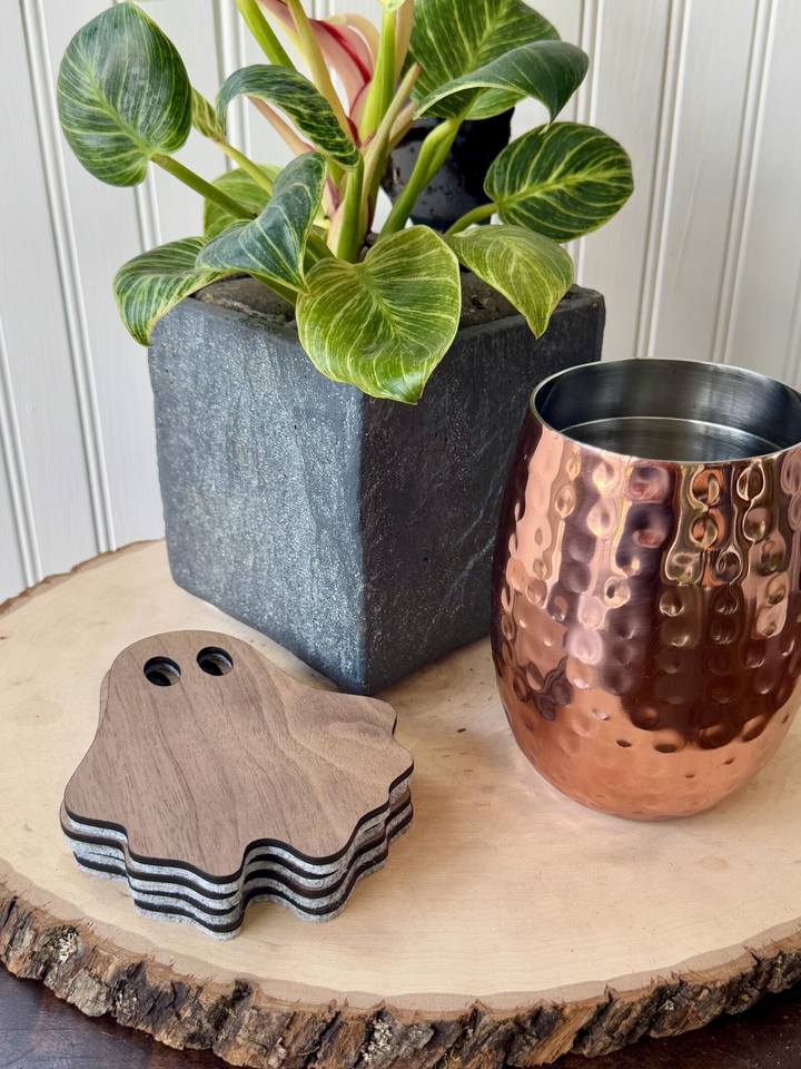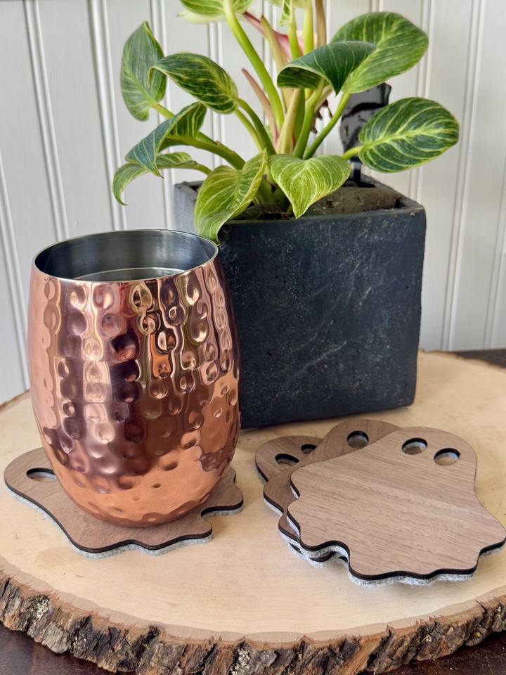 ถาดรองแก้วลายผีทำจากไม้อุปกรณ์ป้องกันเครื่องดื่มแนวฮาโลวีนสวยงามน่ารักทนทานใช้ตกแต่งโต๊ะในฤดูใบไม้ร่วงสำหรับบ้านและปาร์ตี้