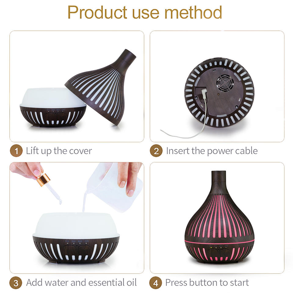 เครื่องกระจายกลิ่นอโรม่าลายไม้ 400 มล. เครื่องเพิ่มความชื้นแบบใช้พลังงานจากยูเอสบีพร้อมตัวตั้งเวลาสำหรับใช้ในบ้านและสำนักงาน